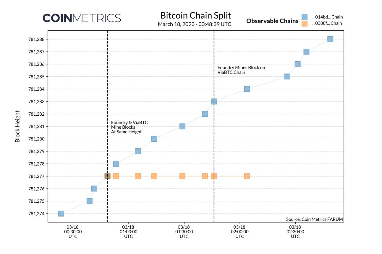 Parker Merritt of Coin Metrics depicted the chainsplit below, where both Foundry and ViaBTC mined the same block height, later causing two versions of Bitcoin’s chain to be formed. One chain, 0388f, was later abandoned as the incorrect Bitcoin chain.