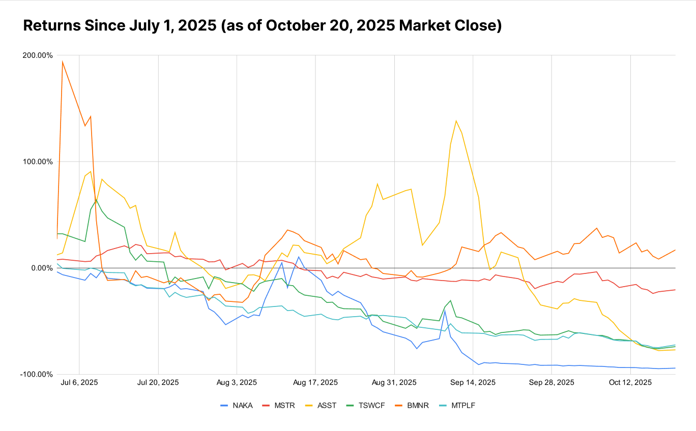 Following the stock’s bloodletting, the company’s multiple on net asset value – i.e., the total value of the company relative to its bitcoin holdings – was 0.7x as of October 10, 2025, according to B. Riley.