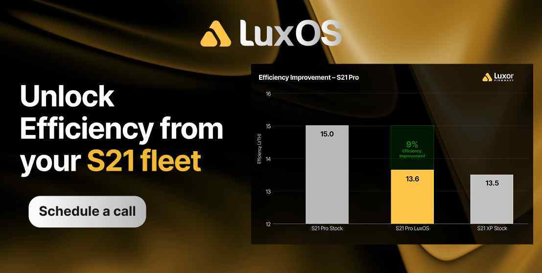 LuxOS delivers meaningful efficiency gains across the S21 lineup. In fact, an S21 Pro running LuxOS can reach better efficiency than stock S21 XP.