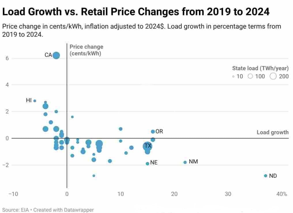 This is clear in states like North Dakota, Nebraska, and Texas, the report notes, which have seen spectacular load growth from bitcoin mining and data centers since 2019 but which have all seen lower inflation-adjusted power prices.