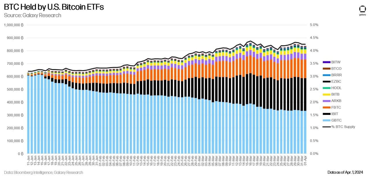 Bitcoin ETFs now hold 4.5% of Bitcoin’s supply, per Galaxy Research.