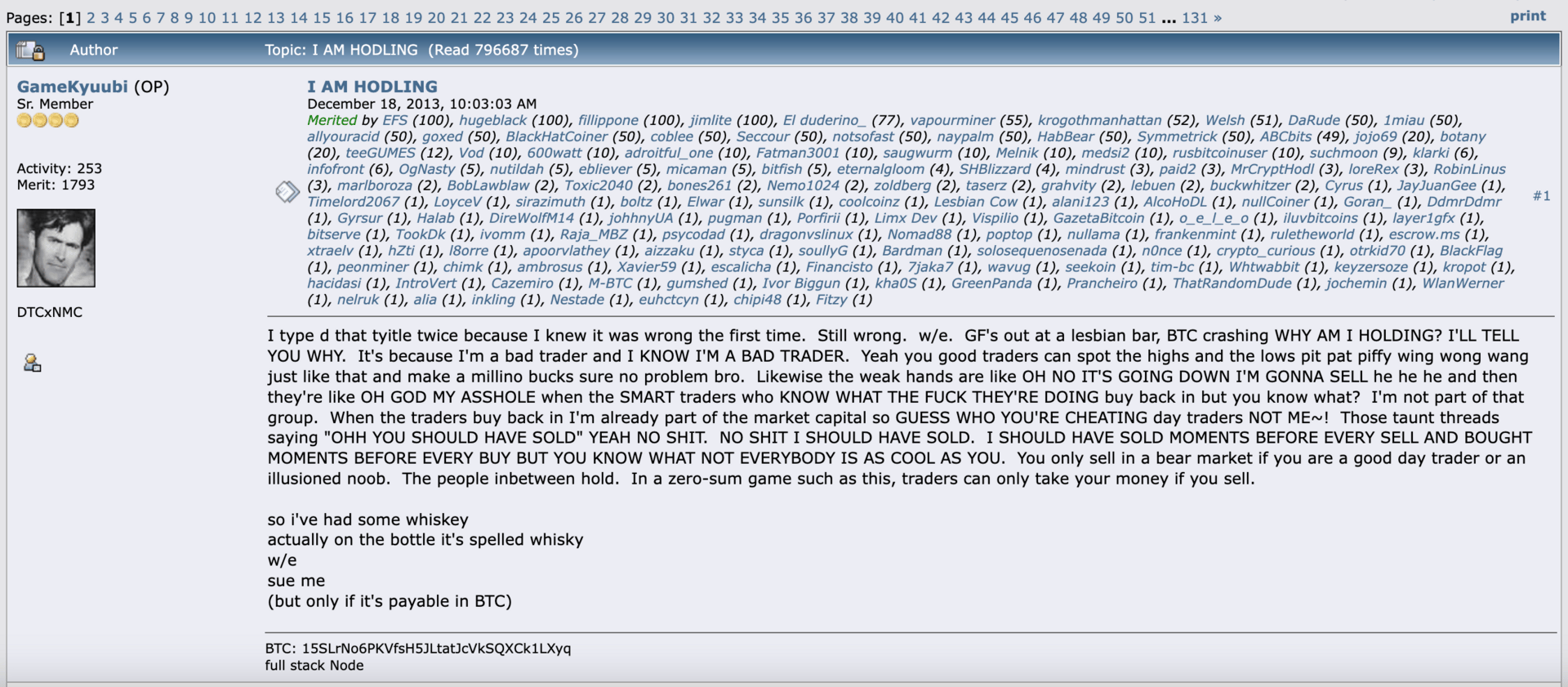 The oft-repeated Bitcoin “HODL” mantra doesn’t mean “Hold on for Dear Life.” It actually comes from a bender-induced typo from a very sauced Bitcointalk user who published a post titled “I AM HODLING” 12 years ago yesterday. The besotted rant has been canonized in Bitcoin lore ever since, and the slang that it birthed has become a rallying cry for Bitcoiners during bearish market conditions.